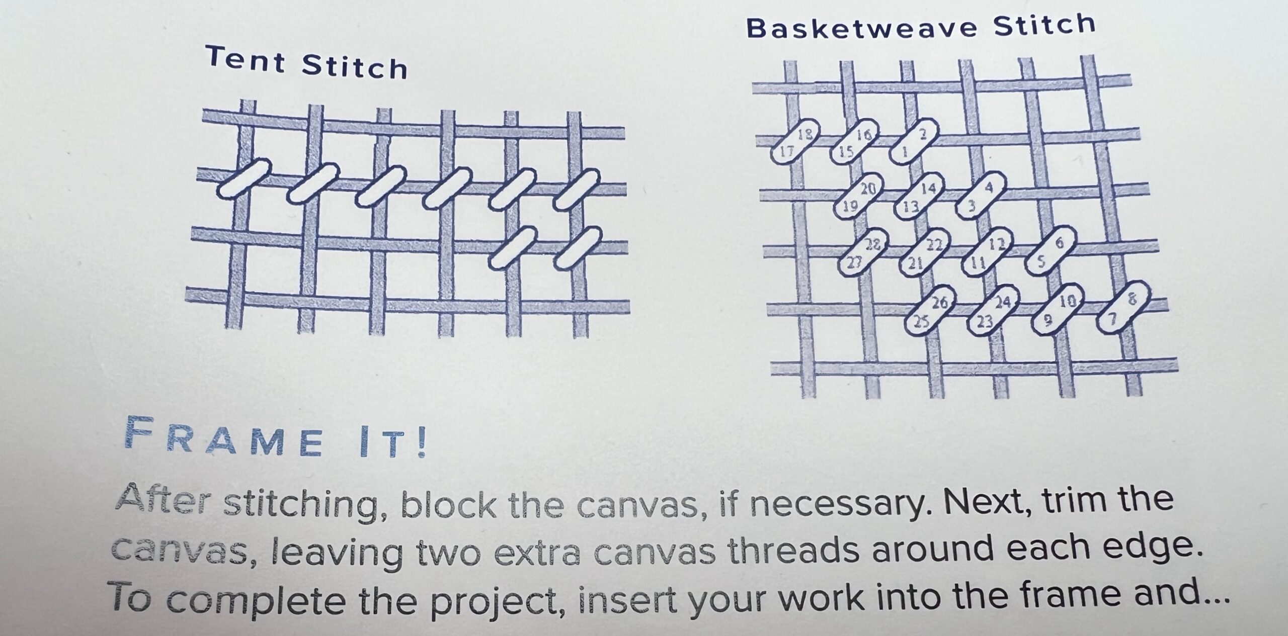 If you stitch in continental your canvas must be blocked. Some canvases we received for finishing are so out of shape, they require blocking twice. Basketweave if done in hand may need blocking. If you do not bring your work in blocked, depending on the need, we will either take it to Mayflower Cleaners in Princeton, and charge you the cost plus a charge for our staff to take it and pick it up, OR we send it out to a finisher who blocks. The finisher who will block is not guaranteeing any return date. Either way it will cost more in time and money.
